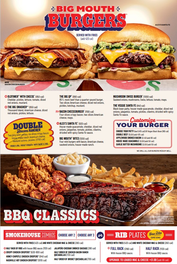 Chili's Grill & Bar invites you to savor bold flavors with their diverse menu that expertly blends American classics with Tex-Mex favorites. The standout Big Mouth Burgers® such as Alex's Santa Fe Burger—layered with guacamole, pepper jack, jalapeños, and drizzled with zesty Santa Fe sauce—offer a vibrant take on the traditional burger. For those craving smoky richness, the Baby Back Ribs, slow-cooked and smoked in-house, come with house BBQ sauce, fries, and creamy white cheddar mac & cheese, showcasing true comfort food. The Smokehouse Combo lets you customize a hearty trio from Chili's best, ensuring a personalized feast.
